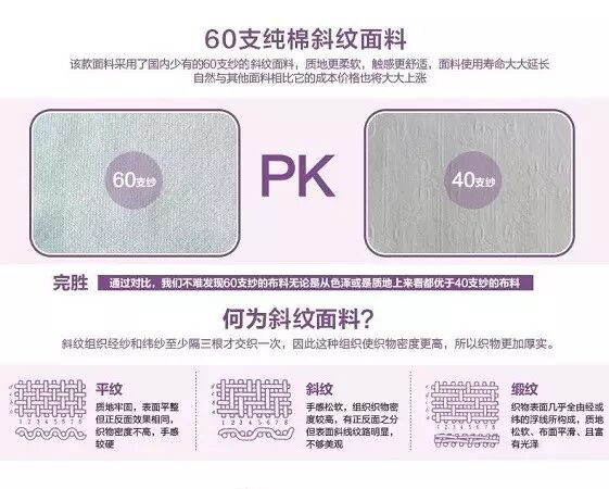 在说这个此之前必须先了解一个知识,就是纱线的支数,多少支是指一克纱的长度,就棉纱而言纱线支数越高越好,说明纱线越细,织出的布就越薄,布相对越柔软舒适。面料支数的选择面很小,无非30支,40支,60支,再高就是80支。