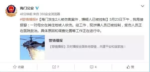 海门公安官方微博今日发布#警情播报#【海门发生2人被伤害案件,嫌疑人已被控制】3月23日下午,我局接报警:一对母女在其住地被人砍伤。经工作,现涉嫌人员已被控制,受伤人员正在医院救治。具体原因和调查处置等工作正在进行中。
