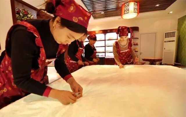 首先将一只只晒干的半圆形的绵兜,扯开一个缺口,拉成绵片,然后由四人面临面拉住绵片四端,用劲将绵片扯成一层层丝绵,说来轻松,做起来就不轻易了。它要依照密度需求,不强不弱、不急不慢地绷扯。要扯成“匀薄如纸”、“莹洁如玉”的柔嫩绵絮才算可以,这个步骤十分的费时,考的是耐力了,一般35个左右的蚕丝棉兜可以拉1斤被胎。