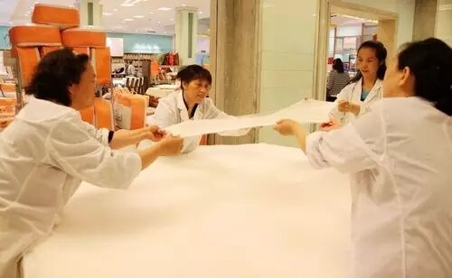 将拉扯好的柔嫩丝絮一层层地叠起来作被芯,再用全棉或真丝作被面或被套,把被芯套进被套的时候要先在内部的四周定好线固定,翻转过来之后被面上面也要适当定位以保证蚕丝被不会滑动变形。